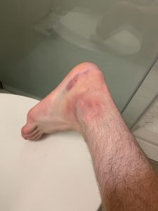 That devastated me, I did not know how I was going to race because the race was a few days away. It was super painful to walk and I got some road rash on my back. When I fell backwards, my heel slammed into the asphalt face of one of the rollers and was all bruised and discolored.